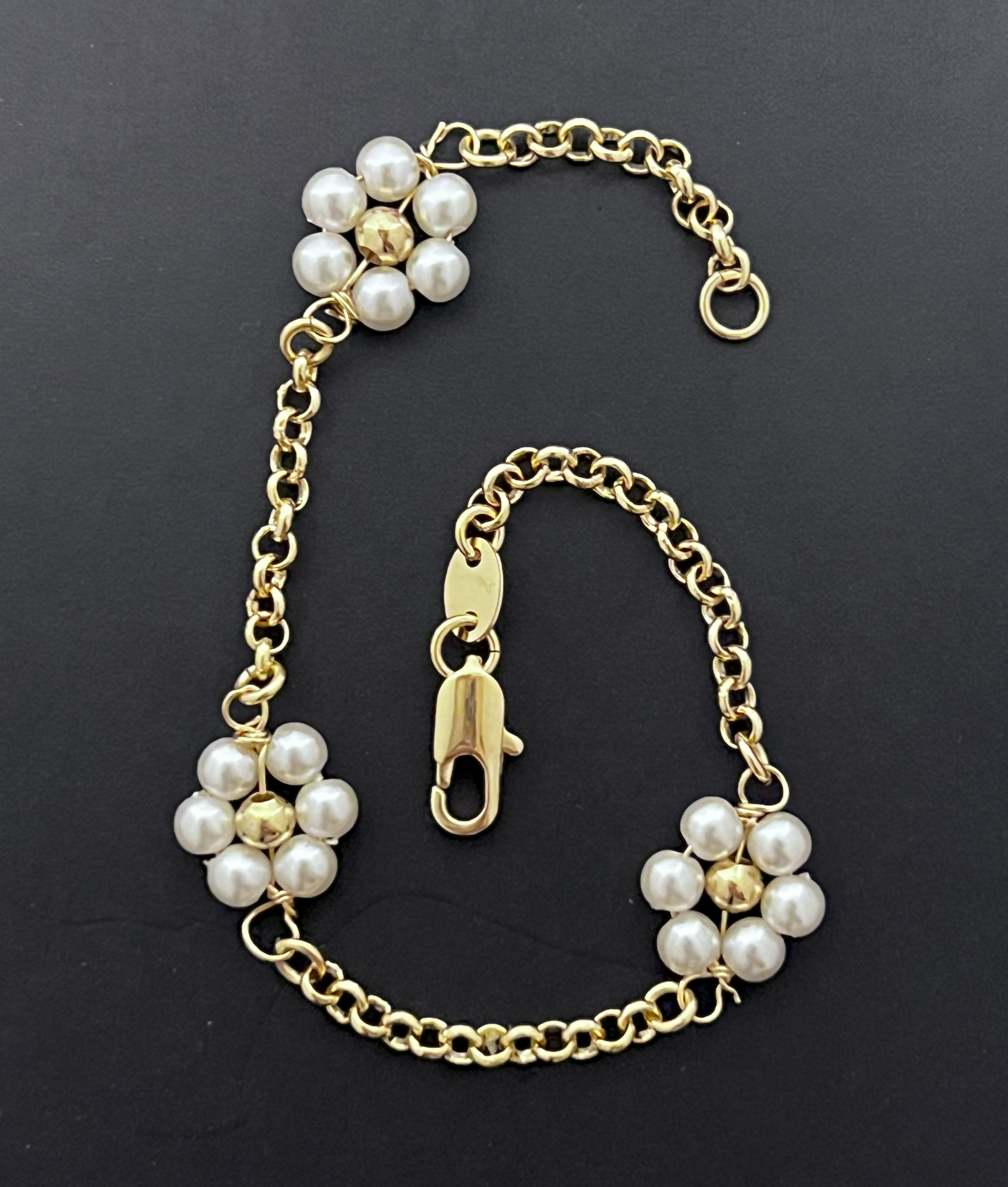 18K Gold-Filled elegant 7.5" piece of flower pearl bracelet.